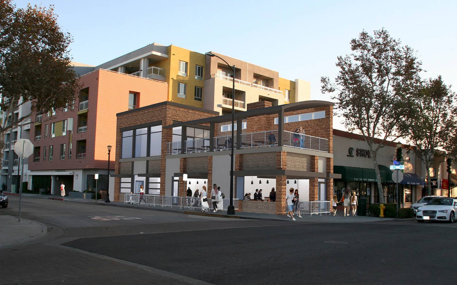 The City of Downey is very interested in its retail zones and therefore wanted some say in the restaurant’s design. The design went through several iterations and reviews by multiple departments in the City of Downey, including the public works, planning, and building departments, before we arrived at a final design. We used advanced techniques to provide realistic renderings to the relevant parties, so they could visualize the restaurant in the context of its surroundings.