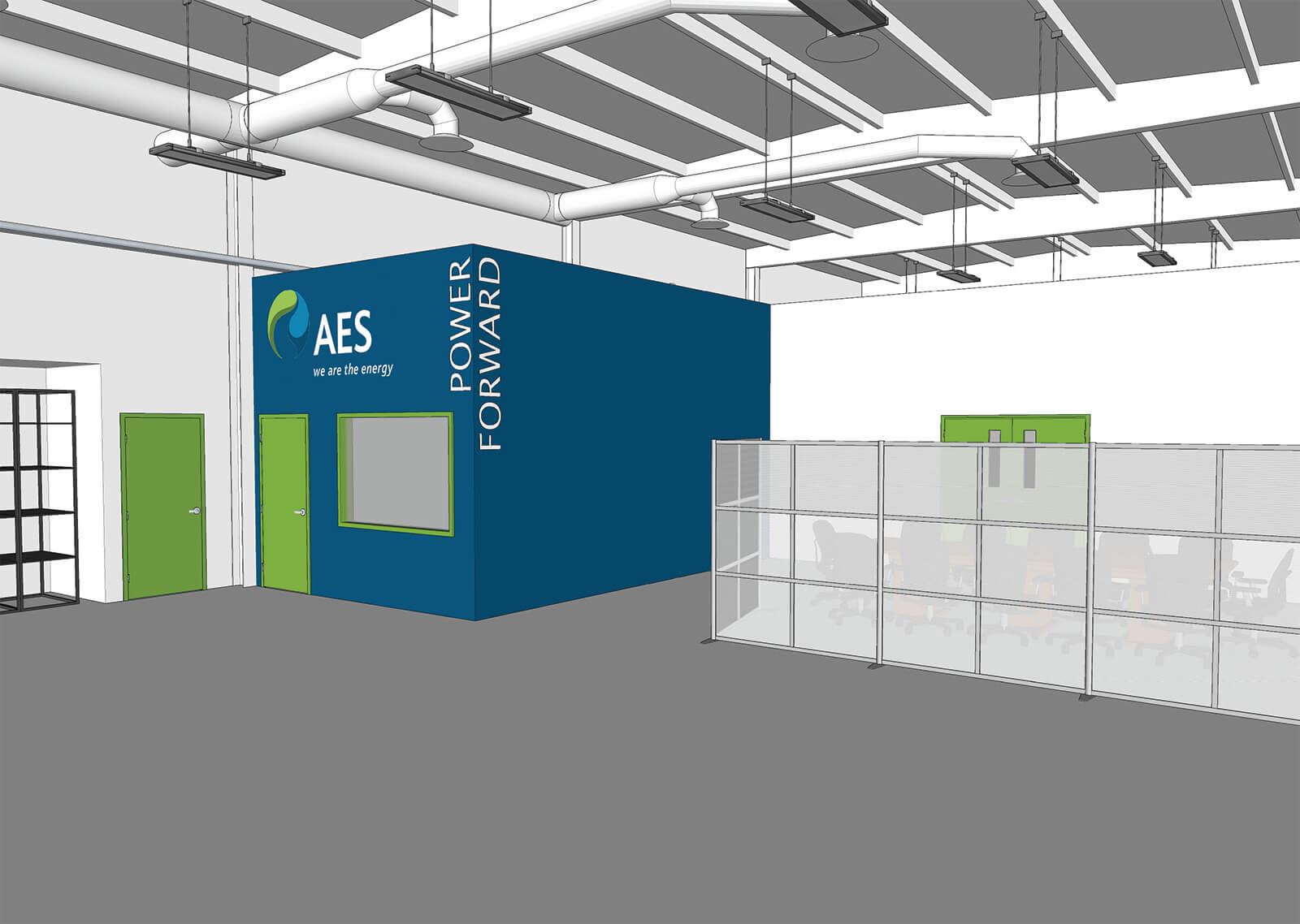 This project included transforming an existing utility building into a technically sophisticated visitor’s center on the site of a local power plant. Materials included colors to match AES branding. We provided colored glass panels to provide interest at the entry. The interior of the space has an industrial look with the exposed framing. We accentuated this by using server racks for display and a divider panel with frosted glass to keep the space open, while still providing an area of separation.