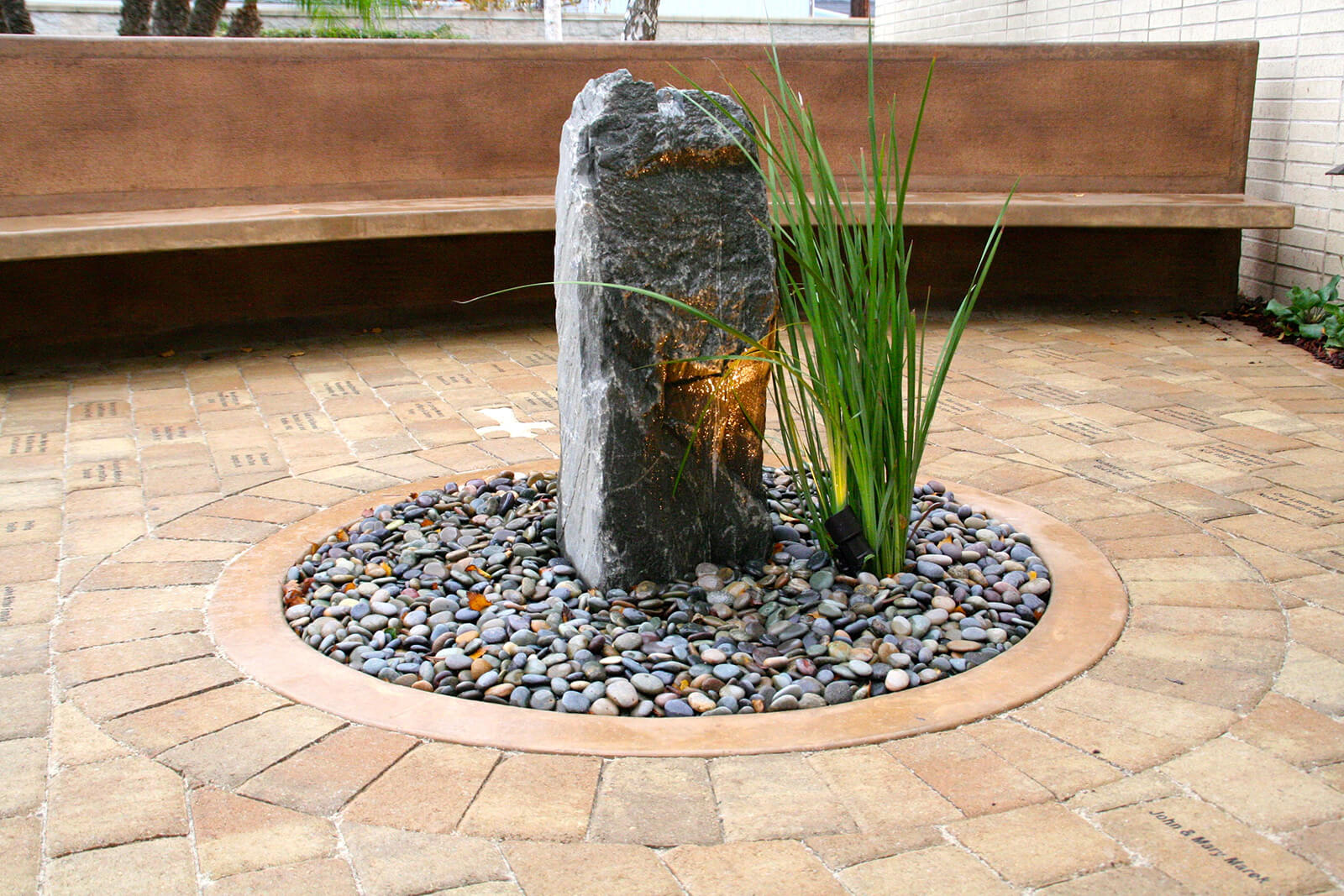 The garden, full of symbols of hope and encouragement, is oriented towards a sculptural rock water fountain. A curved path represents the search for understanding that often accompanies a tragic loss. The sand-colored pavers are etched with inspirational quotes and the names of those who contributed to the project. The arched seating area symbolizes an embrace and provides a focus on the fountain. Seasonal plantings enliven this space, creating an ever-changing area for sitting and quiet reflection.