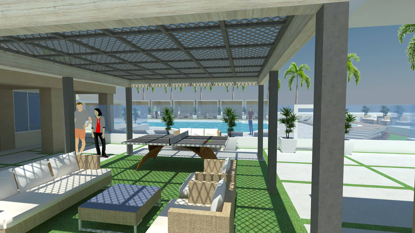 New materials were selected throughout to give the space a luxurious feel. The pool areas feature new pavers, turf areas, and a wood-like ceramic tile at the cabanas and raised deck.